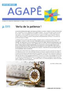 Parution du journal trimestriel Agapê, où vous retrouverez l’agenda de s activités de la paroisse mais également la présentation des différents groupes, une rencontre de paroissiens, des nouvelles des familles, des photos d’évènements. Il sera composé de 4 ou 8 pages en fonction des périodes et événements. Vous continuerez bien sur à recevoir la newsletter de la semaine.