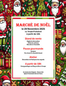 Retrouvons-nous le samedi 29 novembre 2025 pour démarrer la période de l’Avent avec son traditionnel marché pour trouver cadeaux, objets de décorations, gourmandises, couronnes de l’avent, etc. Des activités pour tous et surtout un partage de mug de soupe à 19h. Au plaisir de s’y retrouver ensemble.